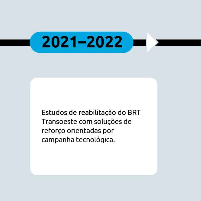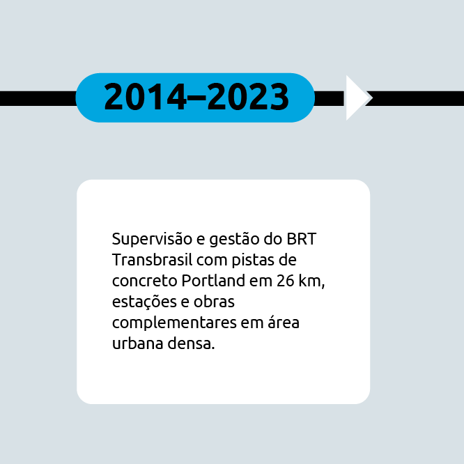Esse percurso desemboca nos BRTs do Rio de Janeiro. No BRT Transbrasil, a empresa gerenciou e supervisionou a implantação de um corredor urbano complexo com pistas em pavimento rígido de concreto Portland ao longo de 26 km (≈96 mil m³, espessura típica de 28 cm), além de estações, passarelas, barreiras e soluções geotécnicas — tudo articulado à gestão socioambiental e às desapropriações necessárias. Em seguida, no BRT Transoeste, coordenou estudos de reabilitação com campanha tecnológica e proposição de reforços para recuperar desempenho e durabilidade. O resultado é uma atuação contínua em corredores de ônibus: do diagnóstico inicial em ambientes densos à entrega e reabilitação de sistemas BRT em escala metropolitana.