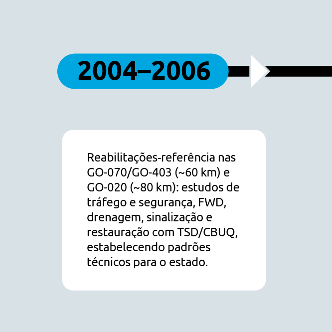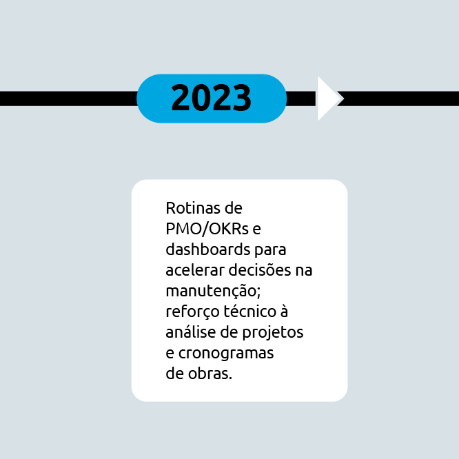 Entregas combinam diagnóstico e reabilitação de trechos (geotecnia com FWD, drenagem, sinalização e restauração), consolidação de bases (IRI, FWD, LVC, inventários e tráfego) e priorização técnico-econômica plurianual para manutenção e reabilitação de toda a malha, suportada por governança de PMO com OKRs na manutenção e por apoio técnico à Diretoria de Obras para padronizar análises de projetos, orçamentos e cronogramas.