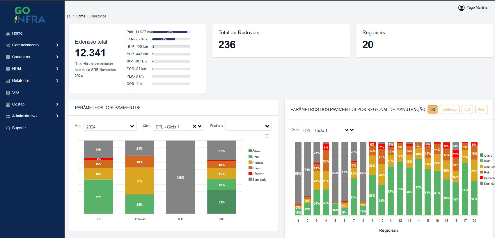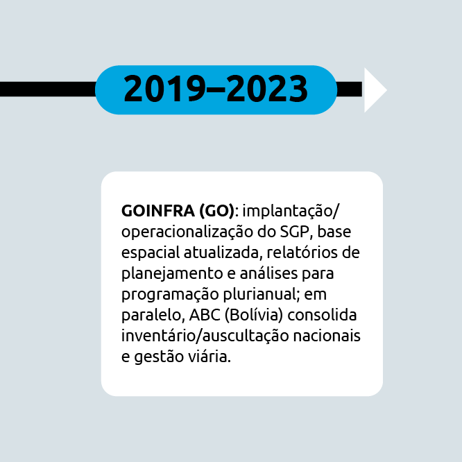 Mais recentemente, apoiamos a GOINFRA (Goiás) na implantação e operação do SGP, com base de dados espaciais atualizada, rotinas de planejamento plurianual, relatórios de planejamento e de análises de levantamentos, além de governança e indicadores para priorização — um passo decisivo para institucionalizar a cultura de gestão por desempenho no estado. Em paralelo, no exterior, apoiamos a ABC (Bolívia) com inventário e auscultação em escala nacional (rodovias e obras de arte), treinamento intensivo e o primeiro arranjo de gestão viária do país.